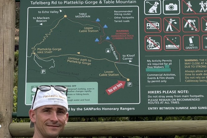 Über den sogenannten India Venster Trail, eine der bekanntesten und zugleich anspruchsvolleren Routen auf den Gipfel, machte sich Piechulek am ersten Wochenende seines Südafrika-Aufenthalts auf den Weg nach oben. Der Weg gilt als besonders spektakulär, führt teilweise steil über Felsen und bietet schon während des Aufstiegs eindrucksvolle Ausblicke auf die Stadt, das Atlantic Seaboard und die Küstenlinie rund um Camps Bay.