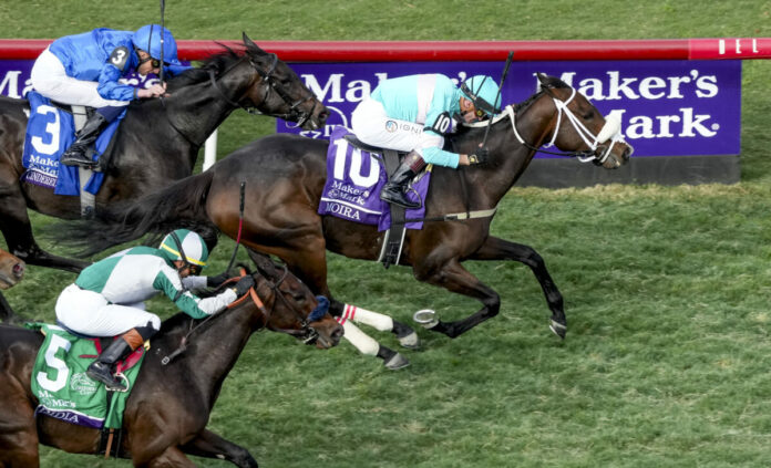 Der Breeders‘ Cup Filly & Mare Turf war das dritte Grasbahnrennen am Samstag, und erstmals am Abend blieb ein in Nordamerika vorbereitetes Pferd vorne. Moira wird von Kevin Attard in Kanada vorbereitet und wurde von Flavien Prat zum Sieg geritten. Für den Jockey war es bereits der zweite Sieg am Abend.