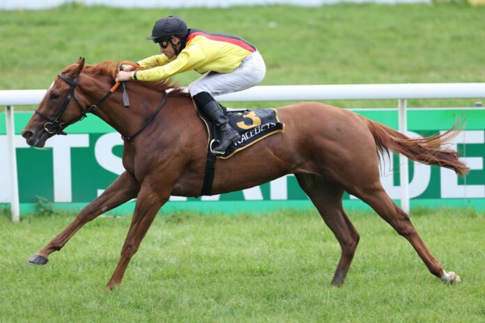 Goldaue, imponierende Siegerin bei ihrem Rennbahneinstand in Mülheim/Ruhr, ist vom Gestüt Auenquelle verkauft worden.