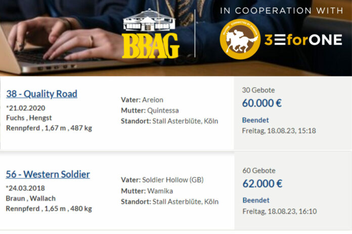 Mit insgesamt 58 erstklassigen Pferdelosen, die zum Verkauf standen, und einem Spitzenverkauf von Lot Nr. 56, Western Soldier für 62.000 €, hat 3forONE erneut bewiesen, dass sie die Kunst der Online-Auktionen meistern.