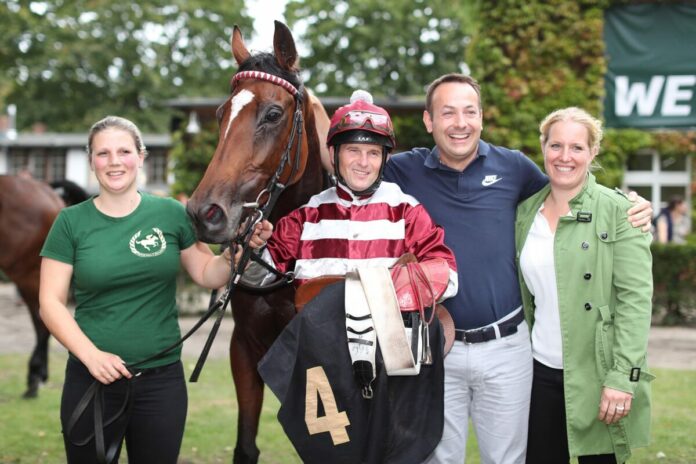 Auch die Trainer freute sich natürlich nach dem Rennen sehr. Doch das war nicht alles. Denn die Siegerin steht in Besitz von MW Racing. Und MW steht für Michael Wrulich, der noch im letzten Jahr als Geschäftsführer auf dem Rennplatz Hoppegarten beschäftigt war. Jobmäßig hat er inzwischen einen anderen Weg eingeschlagen, ist dem Sport als Besitzer treu geblieben.