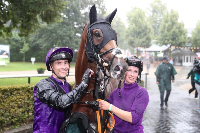 Sarah Steinberg, in München Trainerin und Besitzerin in Personalunion, hat mit dem Wallach offenbar mit viel Geduld ganze Arbeit geleistet, ihn auch selbst in die Startbox geführt und nach dem Rennen wieder in Empfang genommen. Zusammen mit Rene Piechulek, der im Sattel des Wallachs saß.
