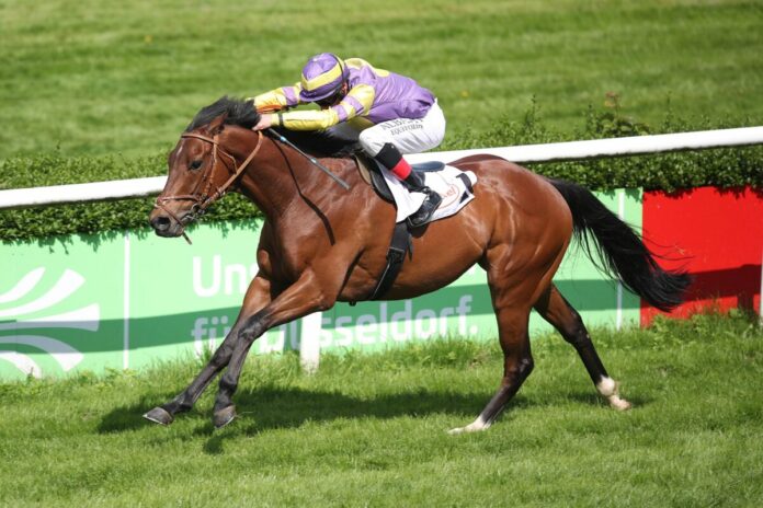 Beim vierten Versuch auf der deutschen Grasbahn gewann endlich Power On (2,5:1). Der in den Niederlanden von Romy van der Meulen trainierte Power-Sohn gewann am Samstag unter Andrasch Starke im Ausgleich IV über 1700 Meter.