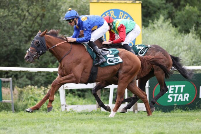 Doch Siegreiter Rene Piechulek konnte seinem Schützling immer wieder neue Reserven entlocken, so dass der Treffer am Pfosten dann doch noch irgendwie leicht wirkte. „Wenn er vorne geht, ist er am besten. Mit den Scheuklappen hatte er auch deutlich besser gearbeitet. Deshalb hat er die auch heute getragen. Das war eine gute Entscheidung“, so Piechulek über den siegreichen Adlerflug-Sohn, der in seinem Quartier auch länger als Kandidat für das Deutsche Derby galt.
