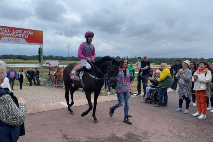 Wahrscheinlich sogar etwas früher, denn Frank Fuhrmanns With Annie Luck trat Mitte der Geraden von weit hinten so flott an, dass die Siegerin sofort feststand. Quasi als Kopie ihres Sieges von Ende Mai, als die für den Stall Hibiskus trainierte Holy Roman Emperor-Tochter schon einmal im Herrenkrug Riesenspeed gezeigt hatte, der letztlich zu einem leichten Treffer führte. „Ich habe sie so geritten wie damals, es hat alles gepasst. Ich denke sie liebt Magdeburg einfach“, so Siegreiter Michal Abik.