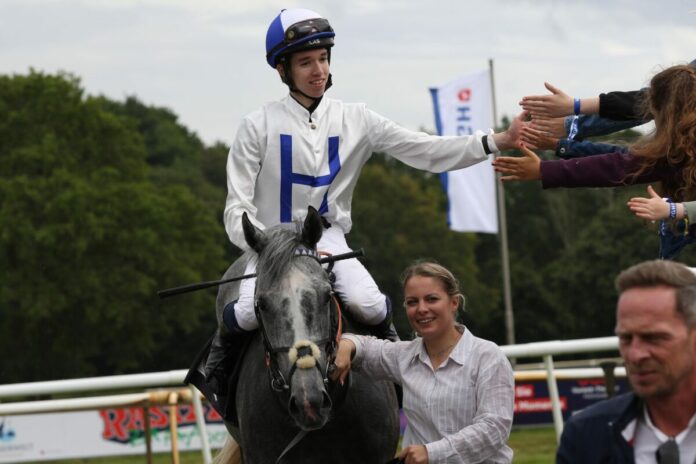 Das Zielfoto wies dann den Schimmel Felippo als Sieger aus. Auf dem Suborics-Vertreter kam der Auszubildende Konstantin Phillip zum Zuge, für den es der erste Sieg in Hannover war. „Ich hatte vom Trainer eine relativ freie Order erhalten und so konnte ich mich aus allem heraushalten. Schön, dass es dann am Ende geklappt hat“, so der Siegreiter im Siegdress von Leo und Peter Hamann.