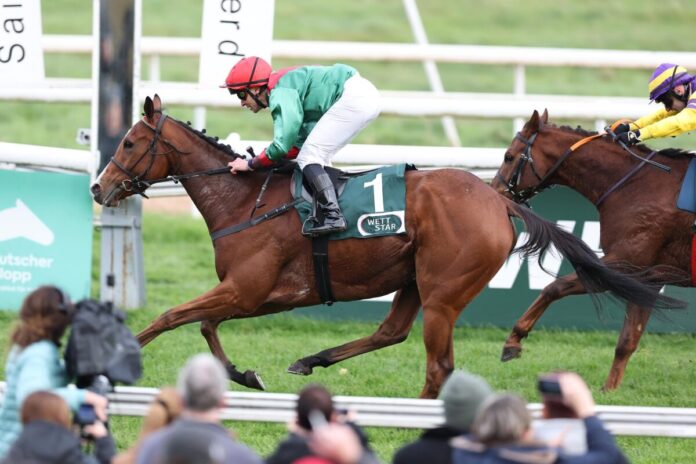 „Sie ist eine tolle Stute, die sehr ehrlich ist und sich immer weiterentwickelt“, erklärte Siegreiter Wladimir Panov. Bacarda tritt in den Farben des Stalles Garden Lounge an.