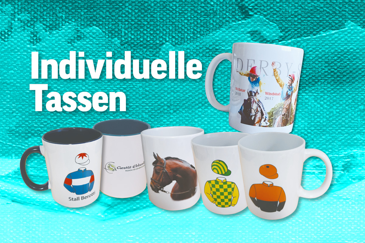 Sie möchten eine Kaffeetasse mit Ihrem Renndress, mit einem Bild Ihres Pferdes, mit einer Collage von Bildern? Der Phantasie sind keine Grenzen gesetzt – wir setzen es für Sie um und Sie erhalten Ihre ganz persönliche individuelle Tasse mit Galopp-Motiv nach Hause.