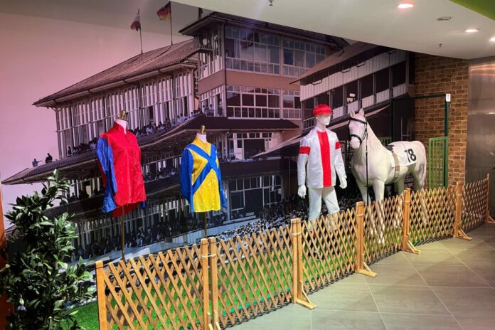 Zu sehen sind in der Werbefläche natürlich die anstehenden Renntermine auf dem Hippodrom in Iffezheim in 2024 und auch eines der bekannten weißen Kunststoffpferde, die ansonsten während der Iffezheimer Meetings in der ganzen Kurstadt verteilt sind. Auch drei berühmte Rennfarben des hiesigen Turfs haben es in das Shoppingzentrum geschafft. So sind die Farben der Gestüte Schlenderhan und Ittlingen genauso wie die Ullmann-Farbe auf drei Schaufensterpuppen präsentiert.