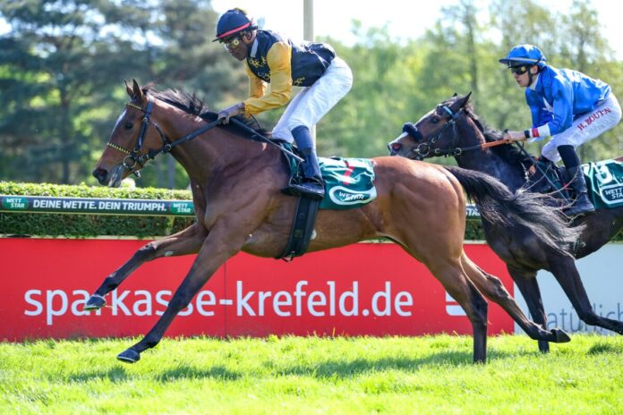 Beim Auftaktrennen der Saison im Krefelder Stadtwald war die drei Jahre alte Stute Nightdance Wood in den Farben der Zuchtstätte der Familie Baum die Siegerin. Im Rennen des Winzerkellers Auggener Schäf, Markgräflerland, setzte sich die Waldpfad-Tochter unter Eddie Pedroza gleich beim Karriereeinstand durch.
