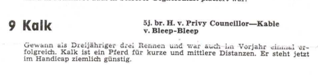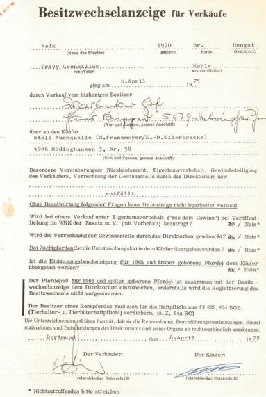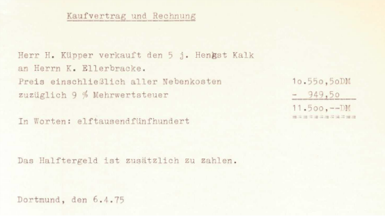 Erworben wurde er für 11.500 Mark auf der so genannten „1. Mülheimer Auktion“, einer Versteigerung im Waagering vor dem Start des ersten Rennens am nachfolgenden Renntag.