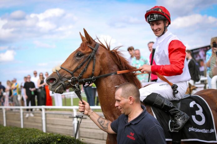 Nun stellte er sich als Wallach vor und das war wohl der Schlüssel zum Erfolg, denn Start-Ziel konnte der Vertreter des Stalles Hanse unter Rene Piechulek eine 2200 Meter-Prüfung als Debütant für sich entscheiden. „Der Rennverlauf war wie geplant, es war natürlich nicht so toll, dass er vor dem Rennen so lange in der Startbox stehen musste, aber man hat gesehen, dass er da viel dazu gelernt hat“, so Siegtrainer Peter Schiergen. Die Verzögerung kam zustande, da der von Waldemar Hickst präsentierte Marc Aurel nicht in die Startbox zu bewegen war und vom Start verwiesen werden musste.