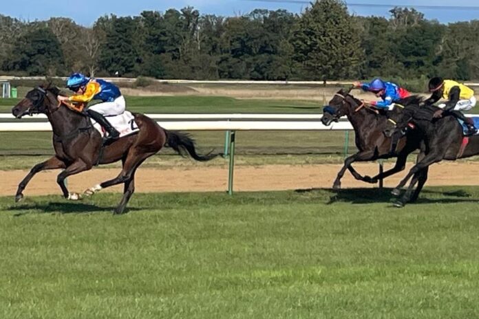 Siegjockey David Liska eilt aktuell von Sieg zu Sieg: „Das war sehr gut, er ist zwar nicht so gut abgesprungen, aber wir haben die Ruhe bewahrt, auf den letzten 400 Metern waren wir dann sehr schnell.“
