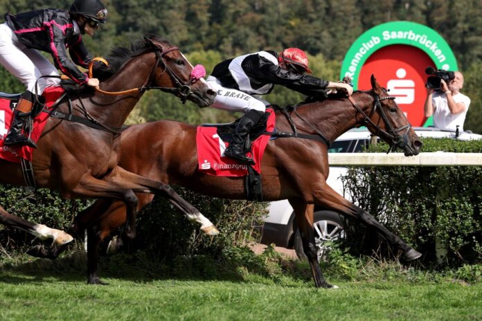 Allerdings kam im Einlauf noch einmal Spannung auf: Let him run free, geritten von Carole Levallois bei deren Renndebüt, startete von der letzten Position und machte im Schlussbogen an der Innenseite rasch Boden gut. Mit einem starken Endspurt kam der Schützling von Fabian Xaver Weißmeier noch dicht an Doro heran und sorgte damit für eine Iffezheimer Zweierwette. Den dritten Platz sicherte sich dahinter Christoph Massers Right Turn unter Marie Gast.