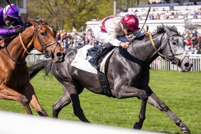Und am Ende kam die Stute aus der Zucht und dem Besitz von Graf und Gräfin von Stauffenberg dann auch gleich zu ihrem ersten Sieg. Die Schimmelstute siegte am Ende sicher, mit einer dreiviertel Länge Vorsprung, gegen die in der Zielgeraden lange führende Nurania, hinter der Grace de Vega (Waldemar Hickst/Thore Hammer-Hansen) dichtauf Platz drei belegte.
