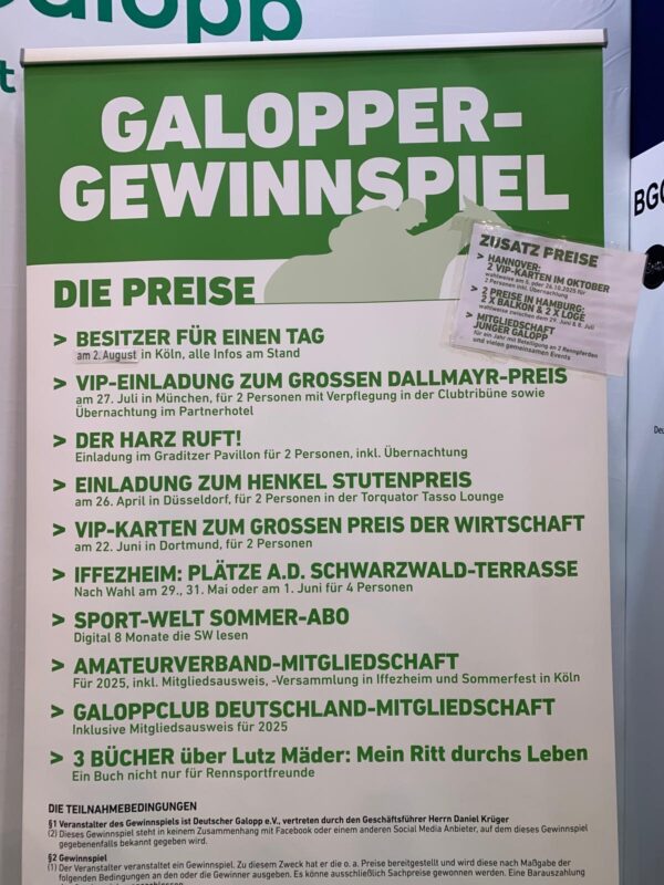 Der Galopprennsport nutzte diese Bühne, um sich einem breiten Publikum zu präsentieren. In Halle 6, am Gemeinschaftsstand von Deutscher Galopp (6G37), können Besucherinnen und Besucher in die faszinierende Welt der Vollblüter und des Rennsports eintauchen.