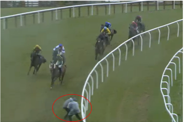 Es hätte am Sonntag in Sedgefield zur großen Tragödie kommen können, doch zum Glück ist nichts passiert. Die kuriose Szene kam im fünften Rennen des Tages zustande.