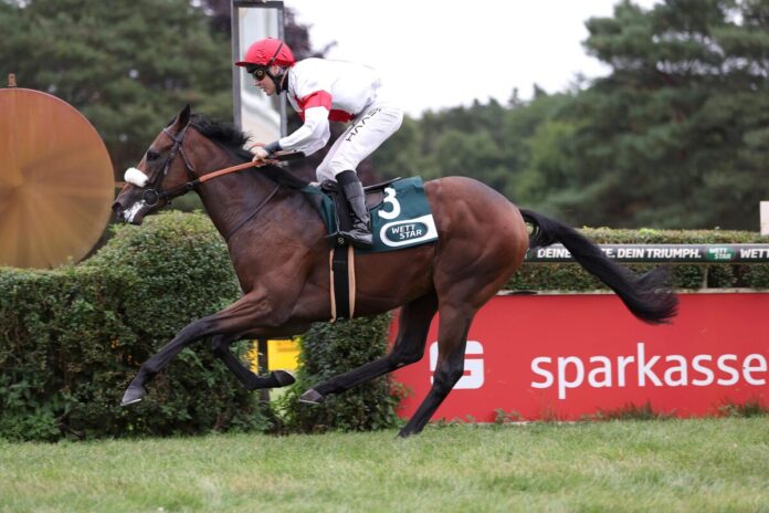 Es war der von Waldemar Hickst vorbereitete Loucas. Der vom Gestüt Hof Ittlingen gezogene und in den Ittlinger Farben antretende Best Solution-Sohn Loucas übernahm direkt vom Fleck weg das Kommando und stiefelte einem quasi nie gefährdeten Sieg entgegen.