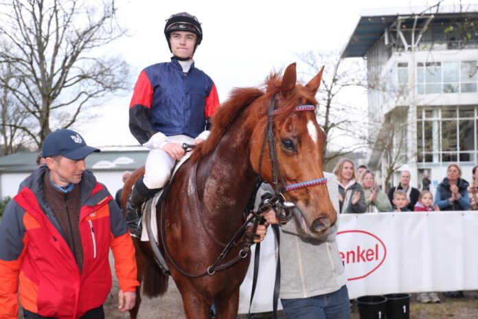 Am gestrigen Sonntag gewann der Vertreter von Trainerin und in diesem Fall auch Besitzerin Sarah Weis sein viertes Handicaprennen beim vierten Versuch. Aufgrund der Unterscheidung der GAGs zwischen der Sand- und der Grasbahn kam er fast mit dem Minimum-GAG an den Start. 51 Kilogramm hatte er dabei am Sonntag zu verteidigen, und das tat er im großen Stil. Hochüberlegen vier, notierte der Zielrichter.