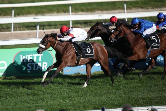 Auch bei ihrem letzten Auftritt im Berliner Fürstenberg-Rennen hatte sie den Pfosten als erstes passiert, wurde dort von den Stewards aber einen Platz zurückgesetzt. Am Sonntag kam die in Besitz des Gestüts Ittlingen stehende Adlerflug-Tochter nun ihrer Wiedergutmachung. Bei ihrem erst zweiten Versuch – nach dem Preis der Diana – auf Gruppe I-Parkett nun gleich der erste Sieg in der Königsklasse. Und das in wirklich sehenswertem Stil.