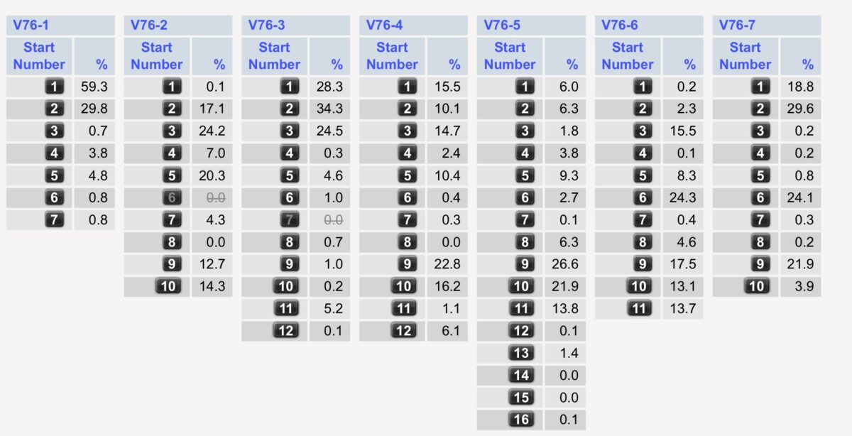 Nachfolgend die Verteilung der Wetteinsätze auf die Starter in den einzelnen Rennen, in Prozenten (Stand 13:30 Uhr, als 11.753 Euro im Topf waren an neuen Wetteinsätzen).