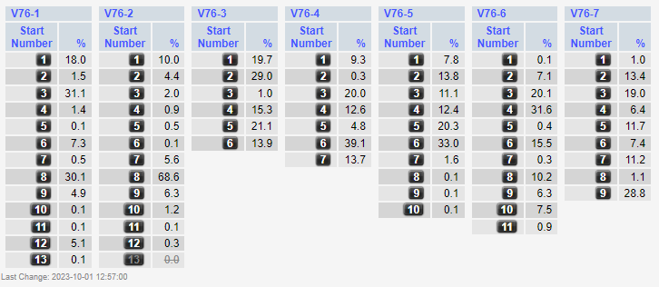 Nachfolgend die Verteilung der Wetteinsätze auf die Starter in den einzelnen Rennen, in Prozenten (Stand 12:57 Uhr, als 13.311 Euro im Topf waren an neuen Wetteinsätzen).