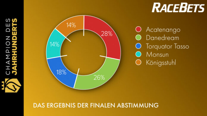 Eine starke vierstellige Anzahl an Rennsportfans aus Deutschland wählte Acatenango mit 28% der Stimmen zum Champion des Jahrhunderts, auf dem zweiten Platz landete Arc-Siegerin und King George-Heldin Danedream mit 26%, allerdings nur mit einem minimalen Nachteil von wenigen Stimmen. Dritter wurde Deutschlands jüngster Arc Sieger Torquator Tasso mit 18%, auf dem vierten Platz landete Königsstuhl mit 14% und Monsun mit 14% auf dem fünften Platz.